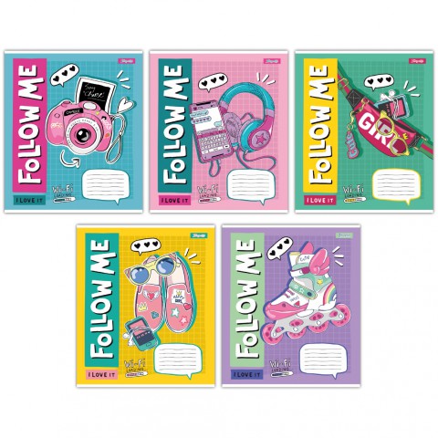 Зошити учнівські 18 аркушів клітинка 1B Follow me, 25 шт. в упаковці – Шкільний аксесуар (18 аркушів, 1B) у клітинку з сучасною обкладинкою. Щільність паперу 55 г/м², кріплення на скобу, кольоровий друк CMYK, ВД-лак. Упаковка містить 25 штук. Зручний для нотаток і креслень. Стимулює активність. Замовляйте на Demsky.com.ua для динамічного навчання!