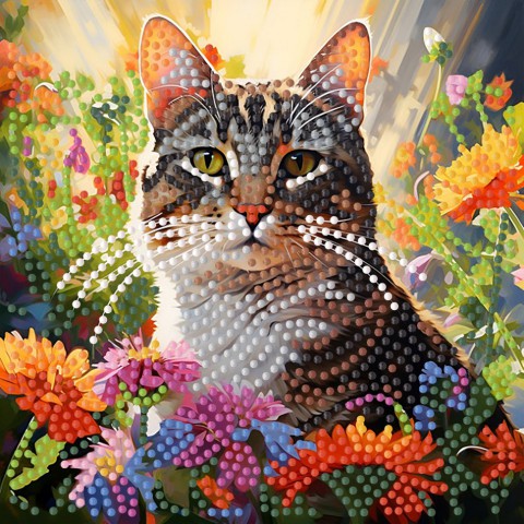 Алмазна мозаїка Strateg ПРЕМІУМ Кіт серед квітів на паперовій основі розміром 18х18 см (ZAV1818-12)