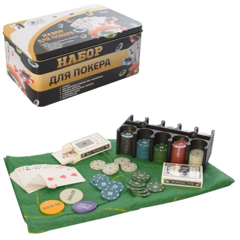 Універсальна настільна гра NP25712-2 Покер, рекомендована для дітей старше 10-ти років, поєднує в собі продумане наповнення, якісне виготовлення та стильний дизайн. Дитячий набір, укомплектований усім необхідним приладдям, включаючи 200 фішок зі зручною підставкою для зберігання, сукно і дві колоди карт, стане відмінним подарунком як для дівчинки, так і для хлопчика. граючи в покер, Дитина розвиває уяву, вчитися приймати самостійні рішення, тренує дрібну моторику, уважність, кмітливість і асоціативне мислення. Оригінальне оформлення з компактною, комфортною для транспортування і зберігання коробочкою, виконаної з металу, яка надійно закривається кришкою, робить цей набір прекрасним подарунком для будь-якого свята. Гра в покер сподобається не тільки дітям, а й дорослим, стане чудовим приводом, щоб провести час з користю в колі друзів.У цьому наборі 2 запаковані колоди покерних карт серії BCG No.92 Extra Selected Club Special ( карт бренду Bee), вироблені в Китаї.Це класична колода для гри в покер на любительському та напівпрофесійному рівні.Карти цієї серії виконані з якісного паперу по стандарту USPCC із захисним покриттям Cambric Finish, що є аналогом ламінації. Сорочка – класична безрамкова сітка, розмір мастей Jumbo Index P – збільшений.