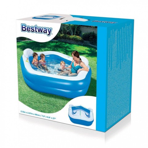 Надувний басейн з сидіннями і підголівниками - відмінне рішення для розваги дітей від 6 років. Квадратний басейн має яскраве і барвисте забарвлення, широкі бортики, надувне дно, м'які стінки. Матеріал виготовлення - гіпоалергенний, міцний і високоякісний ПВХ вініл. Борти - невисокі. Сидіння і підголівники зроблять перебування в басейні дітей максимально зручним.