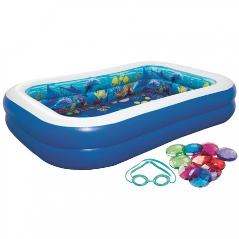 Прямокутна модель "Пошук скарбів" з 3D малюнком підходить для купання і розваг малюків від 3 років. Стінки надувного басейну складаються з двох надувних кілець. На збірку йде не більше 10 хвилин. Басейн дасть можливість дитині відправитися в захоплюючу тривимірну пригоду абсолютно нового виміру, зануритися в глибини світу, відправитись на полювання за скарбами.Модель виготовлена з надійного, безпечного, якісного вінілу. 3D малюнок нанесений на внутрішню поверхню басейну. М'які стінки з широкими бортиками і жорстким дном з ПВХ плівки надають басейну міцність, зручність при використанні. В комплектуючі додається пакет кристалів, міцна ремонтна латка, 2 пари 3D окулярів. Передбачений зливний клапан для спуску води з басейну.Не рекомендується залишати на відкритому повітрі в холодну пору року.