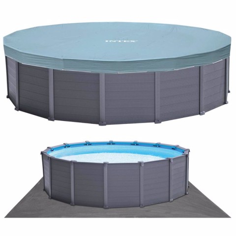 Характеристика на басейн Intex 26384 :Фактичний діаметр - 457 смВисота басейну - 122 смМакс. обсяг басейну - 16805 л.Виробник - Intex Колір - графітовий Форма басейну - круглаМатеріал - тришаровий ПВХ: два шару ПВХ і шар скло-волоконної сітки Каркас - оцинковані сталеві труби Облицювання - пластик (зроблений під графіт)Комплектація басейну Intex 28384 Graphite:*Пісочний насос - продуктивність 4500 л/год, необхідну кількість кварцового піску 12 кг.*Сходи - 132 см зі знімними ступенями і майданчиком*Підстилка з тентом - є.Упаковка - картонна коробка : 131 х 83,5 х 98,7 смВага 228 кг