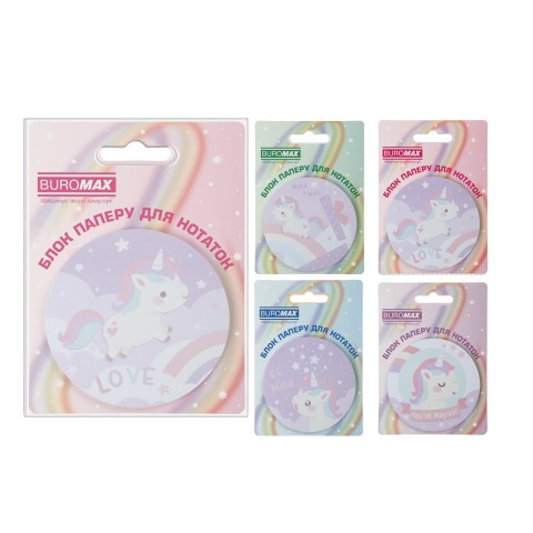 Блок для нотаток Magic Unicorn із клейким шаром, діаметр 70 мм, 30 аркушів, 2 шт. в упаковці. Казковий дизайн із єдинорогами ідеально підходить для дітей.
