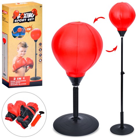 Боксерський набір 2в1, груша 18 см, металева стійка 115 см, настільна груша 36 см, 2 рукавички 20 см, насос - набір 2в1 із грушею 18 см, металевою стійкою 115 см, настільною грушею 36 см, двома рукавичками 20 см і насосом. Для дітей від 6 років.