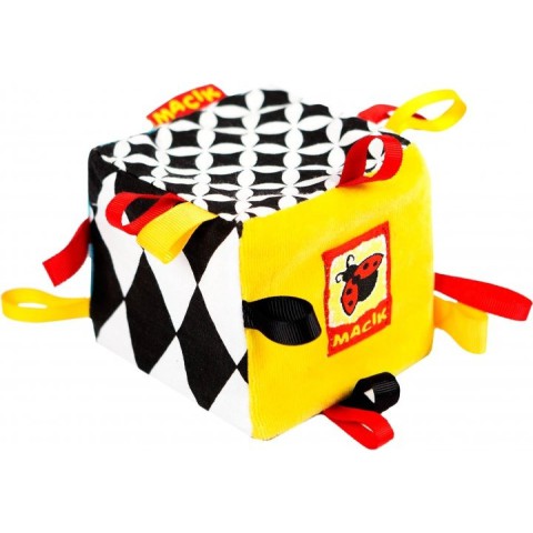 Кубик-іграшка серії Black and White TM Macik пошитий з натуральних, різнофактурних тканин.Його контрастні зображення, лінії і фігури неодмінно зацікавлять малюка, адже їх так цікаво вивчати. Шелесткі деталі і брязкальце усередині подарують посмішку і радість. Різнобарвні петельки малюк буде з інтересом перебирати крихітними пальчиками.Дуже важливо, що ці деталі допоможуть малюкові в формуванні зору і розвитку слуху, сенсорики та дрібної моторики рук.Кубик м'який і абсолютно безпечний для малюка!Іграшка прекрасно переносить делікатне прання і швидко сохне.Склад: бавовняна тканина; різнофактурні матеріали; шийна фурнітура; звукові елементи; поролон.Розмір: 8 × 8 × 8 см.