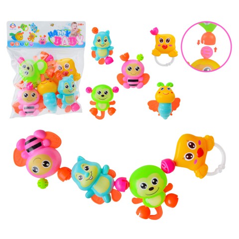 Іграшка виконана у вигляді милих тварин. Також частини брязкальця можна кріпити один до одного, завдяки скріплюючим деталям. Брязкальце сприяє розвитку тактильного сприйняття та навичок дрібної моторики.Розміри іграшки: 34*4*10 смРозміри упаковки: 18,5 см