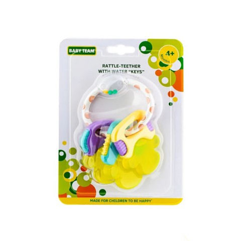 BABY TEAM Брязкальце-прорізувач має три елемента у вигляді ключиків з водою, що з'єднані між собою кільцем. Завдяки цікавій ергономічній формі іграшку зручно та комфортно тримати в маленьких дитячих ручках. Перед тим як дати брязкальце-прорізувач дитині, необхідно його охолодити протягом 2-3 хвилин в холодильнику.