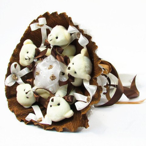 ВАЖЛИВО! Дані букети виготовляються під замовлення, тільки по передоплаті. Термін виготовлення 1-2 дні. Поверненню та обміну не підлягають.Букет з іграшок Ведмедики 5 коричневий Арт. 5287 Букет з іграшок Ведмедики 5 коричневий зроблений з біленьких ведмежат. Ведмедики дуже милі, з бантиками на шиях. У центрі композиції розташована красиво оформлена біла квітка з вкрапленнями маленьких коричневих трояндочок. Між ведмедиками прикріплені бантики з трояндочками. Зовні композиція виконана в біло-коричневій кольоровій гамі. Ручка букета перев'язана красивими атласними стрічками. Зворушливий і, в той же час, лаконічний букетик з ведмедиків стане милим подарунком, який запам'ятається надовго. Додайте яскравості святу за допомогою такого букетика. Композиція складається з 5 ведмежат. Розміри букета 27х30 см. При відправці Новою поштою букет пакується в коробку з об'ємною вагою 5 кг. Оскільки композиція є авторською, повторити її двічі до найдрібніших деталей неможливо, деякі елементи декору можуть бути змінені, при цьому зберігається загальний стиль композиції. ВАЖЛИВО! Дані букети виготовляються під замовлення, тільки по передоплаті. Термін виготовлення 1-2 дні. Поверненню та обміну не підлягають.