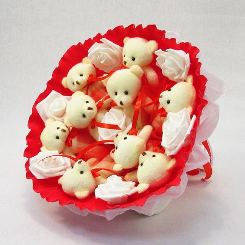 Букет з іграшок Ведмедики 9 червоний зроблений з ведмежат блідо-молочного кольору. Ведмедики симпатичні й забавні, всі з червоними бантиками. Ведмедики розташовані в 2 кола. На папері між ведмедиками і в центрі композиції знаходяться білі штучні (не живі!) троянди, зроблені з латексу (як на весільних букетах). Зовні композиція оформлена в червоно-білому кольорі. Ручка букета перев'язана атласними стрічками.