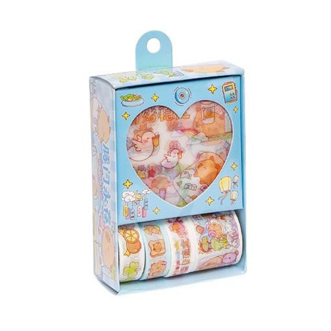 Набір XM-JD2890C містить 4 рулони паперового декоративного скотчу та 4 аркуші наліпок різних форм і стилів. Використовується для декору блокнотів, фоторамок, книг, подарункової упаковки та фотоальбомів. Компактна упаковка розміром 8×3×12 см зручна для зберігання.