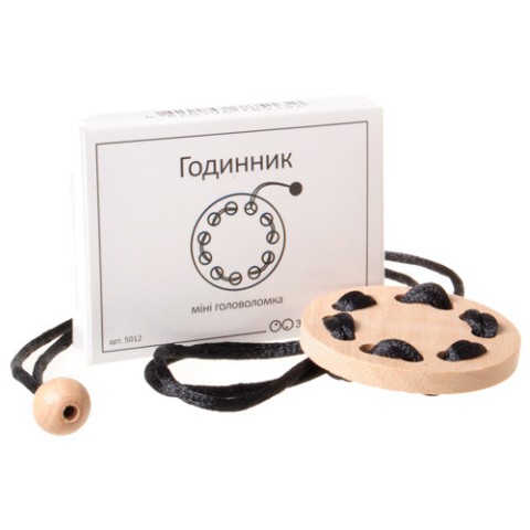 Оригінальна міні головоломка Годинник укр. Заморочка 5012 - унікальна гра, представлена в новій колекції українською торговою маркою «Круть Верть». Неймовірно компактна і легка іграшка підійде для тих, кому часто доводиться подорожувати, і допоможе скрасити проведений час в дорозі. Іграшка являє собою круглий невеликий циферблат, виготовлений з натуральної деревини, в якому зав'язана шовкова мотузочка. Розв'язавши «хитрий» вузлик, необхідно розгадати його загадку і повернути його у вихідне положення або навпаки. Граючи з цікавою штучкою, Ваша дитина буде тренувати дрібну моторику, розвивати логічне та асоціативне мислення. Таке проведення часу позитивно впливає на психоемоційний стан, позбавляючи від негативних емоцій і стресу. Головоломка з лінійки більш складного рівня, рекомендована для дітей старше восьми років, приверне увагу не тільки маленьких, але дорослих любителів логічних задачок.