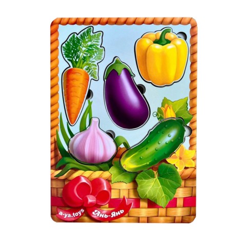 У наборі 15 вкладишів 5-ти видів. Для кожного овоча є 3 вкладиші різного розміру. Маленькі вкладиші ховаються під великими. Для того, щоб їх було зручніше діставати з основи, зроблені спеціальні виїмки. За допомогою такої гри можна познайомити дитину з назвами овочів. Вивчити поняття "більше-менше". Навчити сортувати предмети за формою і розміром.