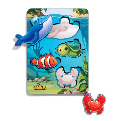 Познайомте дитину з мешканцями підводного світу за допомогою розвиваючих дерев'яних вкладишів "Морські тварини 2" від Ubee. Набір розміром 16×12×0,6 см містить фігурки морських тварин, які потрібно правильно розмістити у відповідні отвори на дерев'яній основі. Фон з підказками полегшує завдання. Іграшка розвиває дрібну моторику, логічне мислення та допомагає вивчити назви морських мешканців.