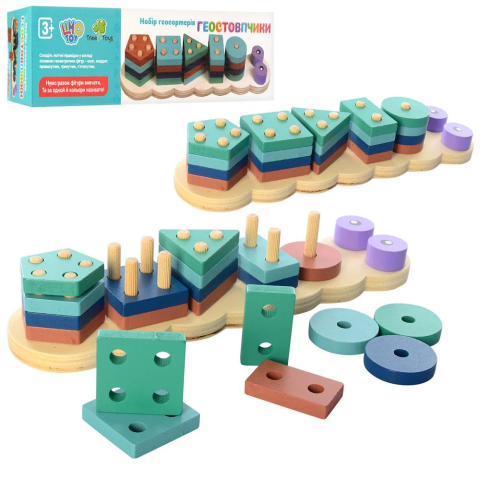 Геостовпчики дерев'яні Limo Toy – набір дерев'яних стовпчиків різних форм і кольорів для вивчення геометрії. Екологічна деревина гладко відшліфована, безпечна для малюків від 2 років, розвиває просторове мислення та координацію.