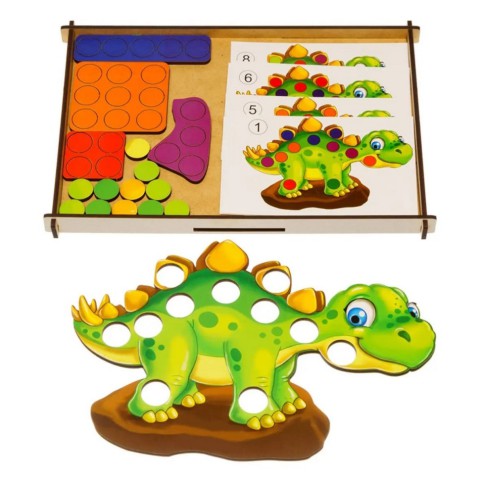 Захоплююча мозаїка у вигляді милого динозаврика. У наборі йдуть картки з різними візуальними завданнями. Малюкові необхідно вставити різнокольорові кружечки за подобою, як це показано на картці. Ця гра – відмінний помічник у вивченні рахунку і кольорів. Запропонуйте дитині придумати для динозаврика ім'я і тоді грати стане ще веселіше.