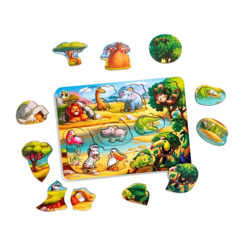 Вкладиші в цій грі - це всі тварини (дістаються) і їх місця хованок (дерева, кущі, печера і т.д). Всі вкладиші зручно діставати пальчиком і вкладати назад за формою деталі і тематикою малюнка.