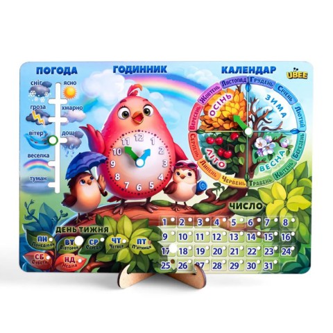 Гра Календар Пташка українською Ubee ПСФ029-УКР – розвиваюча гра для вивчення календарних понять з милою пташкою. Картон якісний, елементи для інтерактиву допомагають вчити дні та місяці українською.