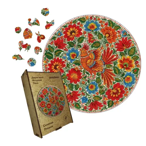 Дерев'яний фігурний пазл Декоративний Розпис Сонячна Пташка, А4, Дерев'яна коробка 100 елементів
