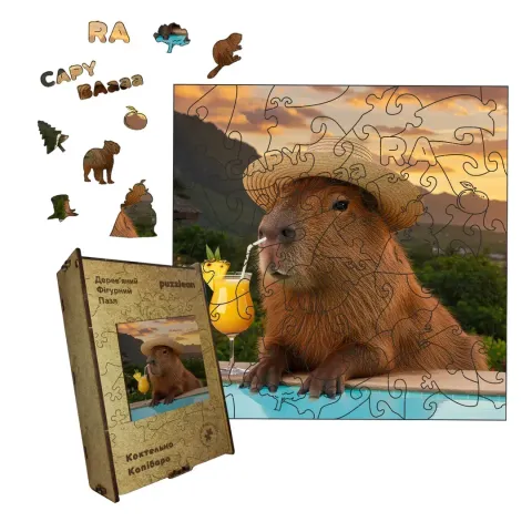 Дерев'яний фігурний пазл Коктейльна Капібара, А2, Дерев'яна коробка 300+ елементів