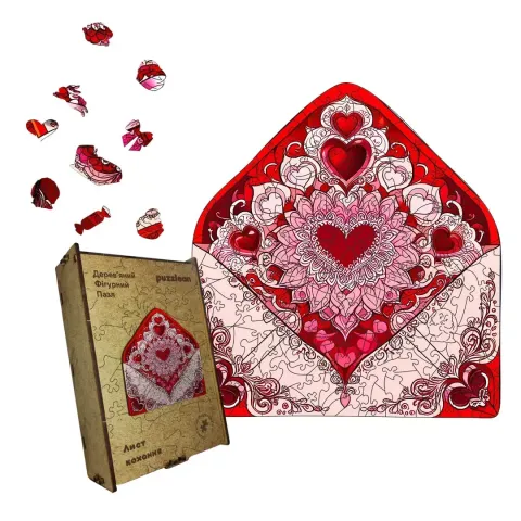Дерев'яний фігурний пазл Лист Кохання, А4, Дерев'яна коробка 100 елементів