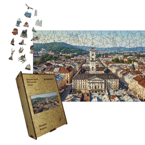 Дерев'яний фігурний пазл Львівська Площа Ринок, А3, Дерев'яна коробка 200 елементів