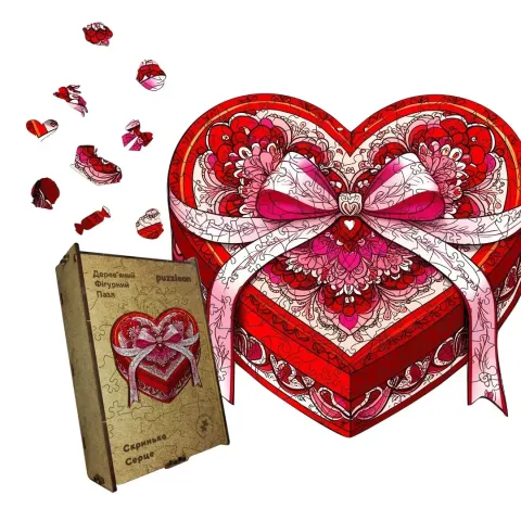 Дерев'яний фігурний пазл Скринька Серце, А5, Дерев'яна коробка 35 елементів