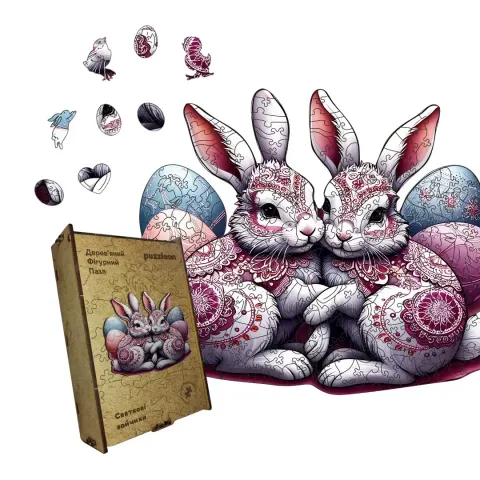 Дерев'яний фігурний пазл Святкові Зайченята, А4, Дерев'яна коробка 100 елементів