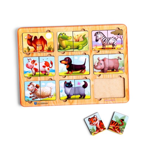 Дев'ять картинок-половинок тварин, які необхідно зібрати на планшеті. Половинки взаємозамінні, можна зібрати не тільки "зебру", але і "кроко-зебру". Деталі зручно діставати пальчиками.
