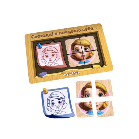 У наборі: 36 деталей для складання 9 пазлів з кольоровим зображенням різних емоцій людини (радість, смуток, здивування і т.д.) та 9 плашок з графічним зображенням емоцій.