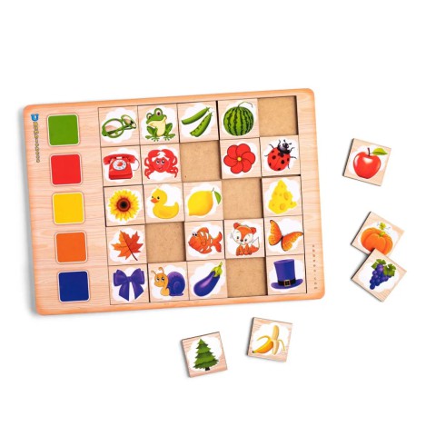 Дерев'яний планшет-рамка, на якому зображені 5 кольорів: червоний, зелений, жовтий, блакитний і фіолетовий. Квадрати в ряд (всього 5 рядів – 25 квадратних плашок) з предметами, пофарбованими в ці кольори. Необхідно правильно зібрати 5 рядів квадратів із зображенням предметів за всіма кольорами.