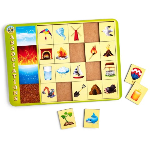 Гра складається з 20 плашок. Такий сортер допоможе пояснити дитині: які існують стихії у природі (вода, вогонь, повітря і земля), де ми зустрічаємо їх і до якої стихії належить той чи інший предмет: сірник - вогонь, хмара – вода, лопата – земля.