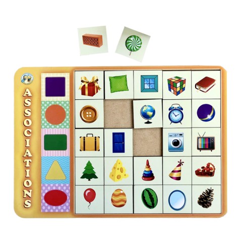 Дерев'яний планшет-рамка, на якому зображені п'ять різних геометричних фігур. Необхідно правильно зібрати 5 рядів квадратів (25 плашок) із зображенням предметів, які за формою нагадують різні геометричні фігури.
