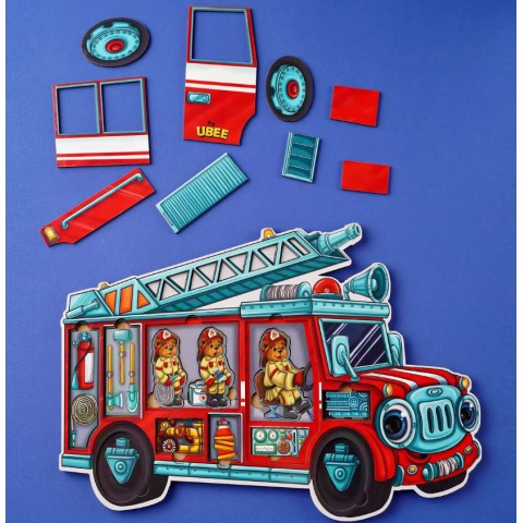 Дерев'яний сортер-головоломка (дерев'яна вкладка) "Ведмедики-пожежники". У наборі 19 деталей. Двошаровий пазл. Ведмедики-пожежники поспішають загасити пожежу на великій та яскравій пожежній машині.