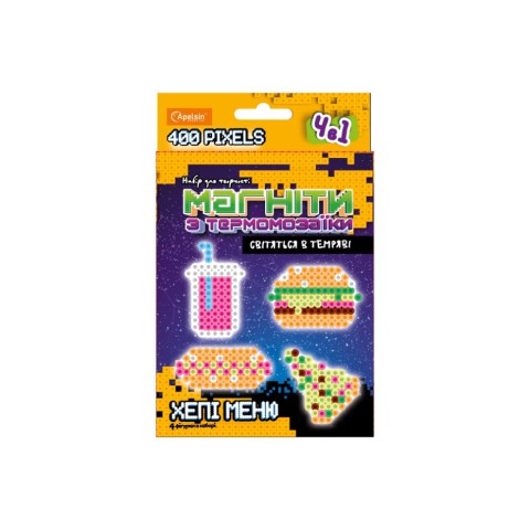 Комплектація:500+ термопікселів для 4 фігурок;пластмасова основа - 1 шт;самоклейна магнітна стрічка для 4 магнітів;інструкція зі схемами для складання;термокалька.Набір упаковано в картонну коробку з європідвісом (розмір: 230×145×30 мм; офсетний друк, матова ламінація, вибірковий УФ-лак).Кількість термопікселів у наборів: 500+Кількість дизайнів: 4 Мова інструкції: українська