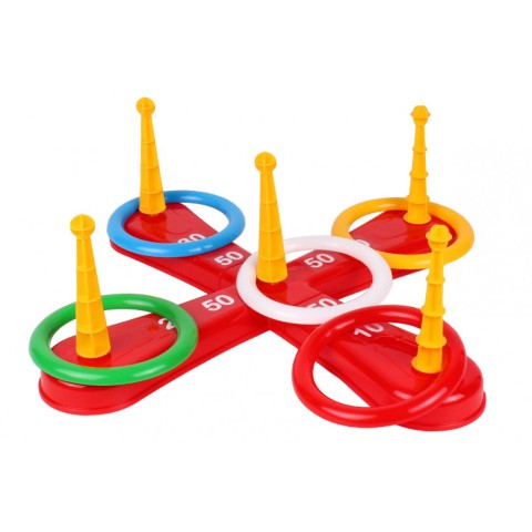 «Кільцекид ТехноК» цікава іграшка для активного відпочинку дітей і дорослих. Її можна використовувати як на свіжому повітрі, так і в приміщенні. Це також динамічна командна гра. Зібравши 2 і більше команди гравців можна влаштувати змагання. Такі активні ігри тренують у дітей дрібну моторику, спритність і влучність, виховують лідерські якості та цілеспрямованість.Перед початком гри необхідно зібрати хрестоподібну основу і вставити в отвори стержні, на які накидають кільця. Числа 10,20,30,50 біля кожного стержня - це кількість балів, які набирає гравець при накиданні кільця на відповідний стержень. Переможцем стає той, хто набирає більшу кількість балів.У наборі: хрестоподібна основа з двох частин, стержні і кільця по 5 шт.