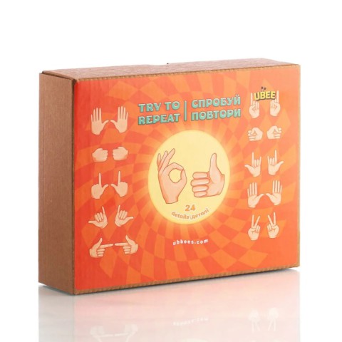 Нейропсихологічна розвиваюча гра для поліпшення взаємодії лівої та правої півкуль мозку, бо треба одночасно відтворити жести обома руками. У комплекті : - 24 долоньки (розміри кожної відрізняються, max довжина 8 см; max ширина 6 см. Матеріал : хдф) - крафтова коробочка для зберігання (22*29*6 см.) Вік: 2+ ( але найпростіші жести); «Спробуй повтори!»- чудова дитяча гра, яка дозволить поєднати приємне з корисним. Вона покращує реакцію та уважність, розвиває просторове мислення та дрібну моторику. Спочатку уважно розгляньте з дитиною усі долоньки та запропонуйте якусь відтворити. Правою та лівою ручкою по черзі. Коли дитинка може одночасно обома руками відтворювати зображення, то можна викладати різні комбінації пар і відтворювати зображення на швидкість, тобто ускладнювати завдання. Мама може робити жести своїми руками, а дитина дивиться і знаходить їх в коробочці серед інших долоньок. Поясніть значення жестів та вивчить назви кожного пальчика.