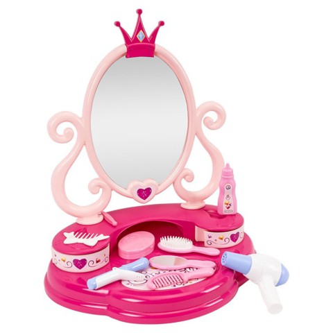 Цей стильний столик має велике наповнення, яке дозволяє Вашій дитині грати в стиліста або перукаря, робити зачіски та макіяж. В комплекті столика окрім трюмо є гребінець, щітка, дзеркальце, пінцет, заколка-гребінець, плойка, пудрениця, фен, тюбик крему - всього 9 аксесуарів.