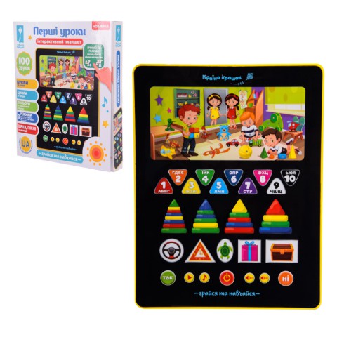 Інтерактивний навчальний планшет обов'язково сподобається малюкові. Він зручний, його легко можна взяти з собою на прогулянку. Планшет допоможе малюкові вивчити літери та цифри, а також просто відпочити і пограти у веселі ігри. Завдання на планшеті підходять для дітей дошкільного віку.Завдання навчального планшета:«Вчимо літери та слова». Увімкнення режиму назви літер та слів, натискаючи на цифри.«Вчимо цифри та фігури». Увімкнення режиму назви цифр, фігур та форм."Порядковий рахунок". Натискайте на цифри та слухайте порядковий рахунок кольорів."Знайомство з героями". Натискайте на дітей, малюнки, слухайте вірш від Оленки, і про улюблені іграшки."Іспит". Слухайте уважно запитання та натискайте правильні відповіді. Після двох неправильних відповідей, планшет автоматично поставить наступне питання. При правильній відповіді дитина почує слово «молодець», при неправильній відповіді «спробуй ще раз»."Про героїв". Перевіримо, чи ти запам'ятав, що подобається нашим героям. Будь уважним!"Так чи ні". Весела гра на увагу. Слухай запитання та натискай на кнопки «так» чи «ні»."Мелодії, пісня, вірш". На тебе чекає весела пісня про рахунок, вірш про ноти та мелодії.Озвучено українською мовоюФункції:- регулювання гучності- вивчення літер та слів- вивчення цифр та фігур- вивчення квітів та порядкових номерів- 3 режими гри- вірші- пісні- мелодіїБатарейки 3 шт. типу ААА (не входять у комплект)