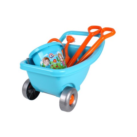 Іграшковий набір для маленьких садівників - все найнеобхідніше для допомоги батькам в саду.Основа набору - блакитна тачка з двома міцними колесами і ніжкою. Конструкція робить її стійкою до перебросам на поворотах, спусках або підйомах. Широка ручка дозволяє дитині тягнути тачку двома або однією рукою. В тачці можна перевозити яблучка, зібрані в саду, листя, пісок або навіть своїх іграшкових друзів)Яскрава лійка, з двома ручками зручна для малюків - з допомогою однієї легко переносити лійку з водою, а тримаючи за обидві - поливати квітник. Лопатка і грабельки будуть корисні восени, коли потрібно збирати сухе листя. Відерце з яскравою наклейкою - необхідний атрибут для кожного садівника і ігор в пісочниці.Граючи в садівника, дитина вчиться піклуватися про дерева і квіти. Такі ігри виховують любов до природи, розвивають уяву, фантазію і творче мислення. А час, проведений з батьками на свіжому повітрі - неоціненне.Всі елементи набору виготовлені з міцного і якісного пластика, без запаху.У наборі: тачка, лійка, відро, лопата і граблі. Упаковка - сітка.