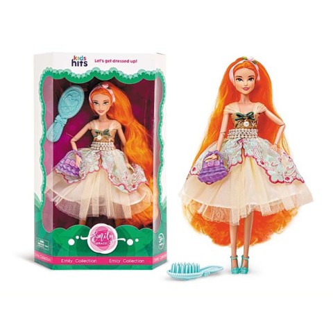 Лялька Kids Hits Emily Romantic з аксесуарами одягнена в гарне, романтичне вбрання - дизайнерську сукню з візерунками, у вінтажному стилі. А доповнюють її образ такі аксесуари, як пов'язка з квітами, туфлі та сумочка. У комплект також входить гребінець. Особливості: розкішне довге і густе волосся рудого відтінку; наявність рухомих шарнірних з'єднань частин тіла (це гнучкі коліна, лікті, зап'ястя); якісно віддруковані очі; виготовлена з високоякісного матеріалу. Висота ляльки: 28 см. Рекомендовано для дітей від 3-х років.