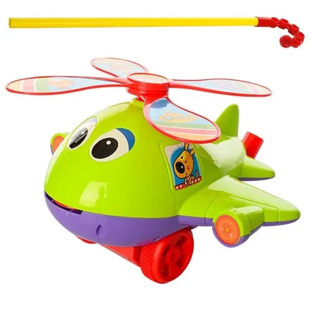 Каталка Вертоліт на палиці буде цікава діткам, які тільки навчилися ходити або ходять давно. Каталочка яскрава і привертає малюка. Розмір 41см. Вертоліт зі звуком, при русі обертаються гвинти і висовується язик.