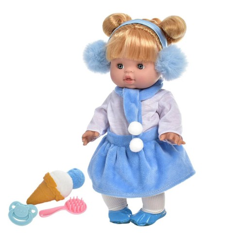 Лялечка одягнена в красиву кофтинку, плюшеву спідницю, колготи та капці. На голові атласна пов'язка із помпонами. На спині розташована кнопка, натиснувши яку, лялька відтворює 5 дитячих пісень. Для активації кнопки потрібно повністю вийняти музичний механізм і видалити заглушку. Після цього механізм встановити назад. Озвучення: українська мова; У комплекті: - Лялька; - іграшка – морозиво; - пустушка; - гребінець; Висота ляльки: 31 см; Розміри упаковки: 22х36х10,5 см Упаковка: коробка; Вікова категорія: 3+