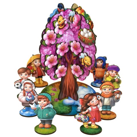 Захоплива розвиваюча гра допоможе дитині вирушити у цікавий світ природи, що випромінює різні барви в залежності від пори року. Це яскраве об’ємне дерево змінюється залежно від сезону: взимку воно засинає під білою ковдрою, навесні вкривається ніжними біло-рожевими квітами, влітку радує соковитими абрикосами, а восени – золотавим листям.