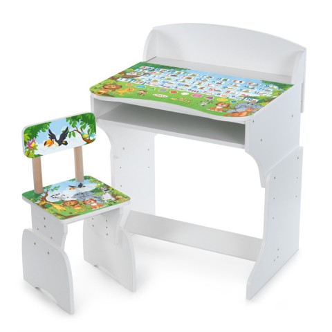Дитяча парта M 301 оснащена просторою стільницею, де зображені літери українського алфавіту, що допомагає дитині в ігровій формі закріплювати знання. Під стільницею знаходиться зручна полиця, куди можна скласти книги, зошити та канцелярське приладдя, звільняючи робочу поверхню. Для більшого комфорту передбачена підставка для ніг, а невеликий борт в задній частині столу не дасть олівцям або дрібним предметам скочуватися.