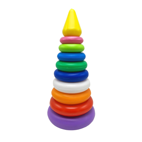 Класична весела пірамідка з кольоровими кільцями, які потрібно нанизувати на вісь. Допоможе малюкові вивчити кольори та розміри.