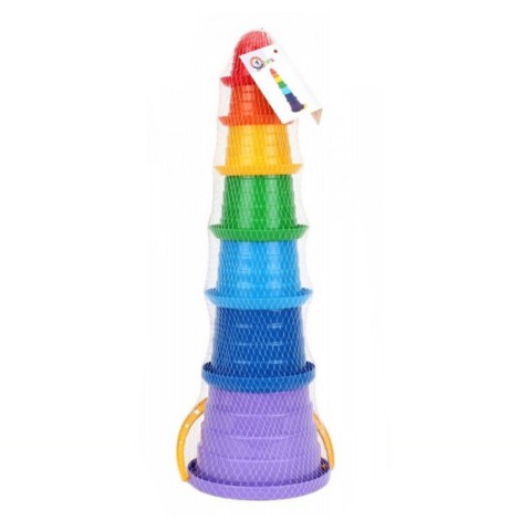 Пірамідка з 7 яскравих елементів. Сьомий елемент - відерце з ручкою, куди можна скласти всі елементи. Малюк складає високу пірамідку з відерцем в основі або вкладає елементи один в одного. За допомогою цих формочок можна робити різні фігурки в піску. Кольори підібрані в "райдужному" порядку.