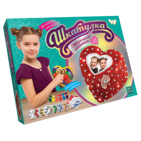 Дитина зможе створити справжній витвір мистецтва власними руками, відкриє нові таланти. У дитини розвивається дрібна моторика пальців, акуратність, логічне мислення.Особливістю даного набору є простота виконання: розфарбовування акриловими фарбами форми-заготівлі та декорування готового виробу дизайнерськими матеріалами.Комплект містить:- скринька пінополістиролова;- комплект із 6 кольорів акрилової фарби на водній основі;- пензлик;- комплект різнокольорових палеток на самоклейці;- акриловий лак на водяній основі;- Інструкція.