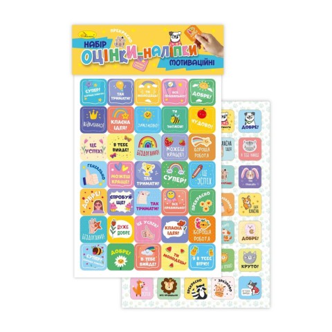 Мотиваційні оцінки-наліпки - саме те, що потрібно для вербального оцінювання в початковій школі, де оцінки відсутні. Також вони прекрасно підійдуть для використання в дитячих садочках. Ці яскраві стікери точно сподобаються дітям і замотивують їх до навчання.Оцінки-наліпки містять мотивуючі фрази, що спонукатимуть до дії, впевнено йти до своїх цілей, позитивно мислити, вірити в себе та свої сили.За допомогою оцінок-наліпок вчителі зможуть реалізувати методику заохочення маленьких учнів, у щоденники яких будуть вклеюватися симпатичні зображення із різноманітними фразами по типу:- дуже добре;- відмінно;- геніально;- бездоганно;- набагато краще;- спробуй ще;- я в тебе вірю;- ти зможеш;- це успіх;- хороша роботата багато інших.Формат/розмір: А5Кількість аркушів: 2Пакування та скріплення: запаковані в пакет поліпропіленовий з кольоровою картонною бандероллю.Блок: папір самоклеючий, крейдований папір; фігурна підсічка.