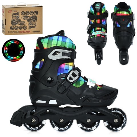 Особливу увагу привертає внутрішній чобіт із барвистим принтом у формі різнобарвних клітин — він додає характеру та робить ролики помітними на вулиці. А світні колеса не тільки мають ефектний вигляд у русі, але й покращують видимість у сутінку.