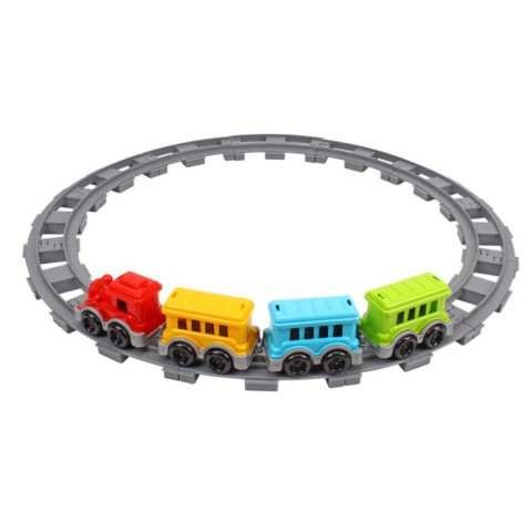 У наборі 16 елементів: локомотив, 3 яскравих вагончики та 12 елементів залізниці, які легко з'єднуються, як пазли.